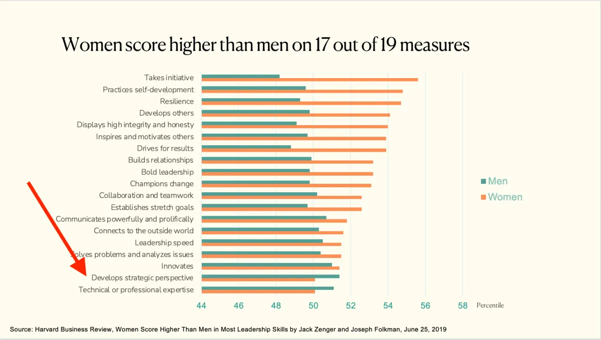 ➝ Despite outperforming on 17 of 19 leadership measures, women are scored near the bottom on “develops strategic perspective.”